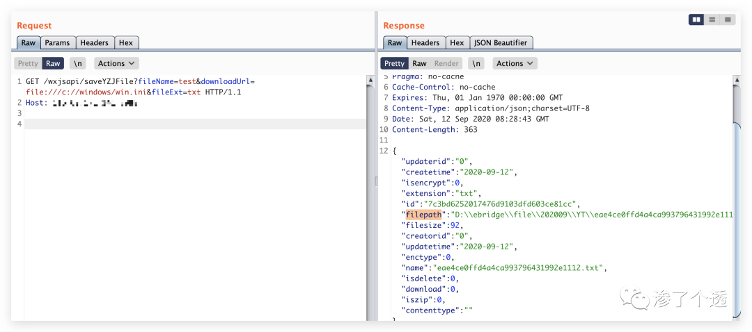 未授权任意文件读取,/wxjsapi/saveYZJFile接口获取filepath,返回数据包内出现了程序的绝对路径,攻击者可以通过返回内容识别程序运行路径从而下载数据库配置文件危害可见。 1、 downloadUrl参数修改成需要获取文件的绝对路径,记录返回包中的id值。